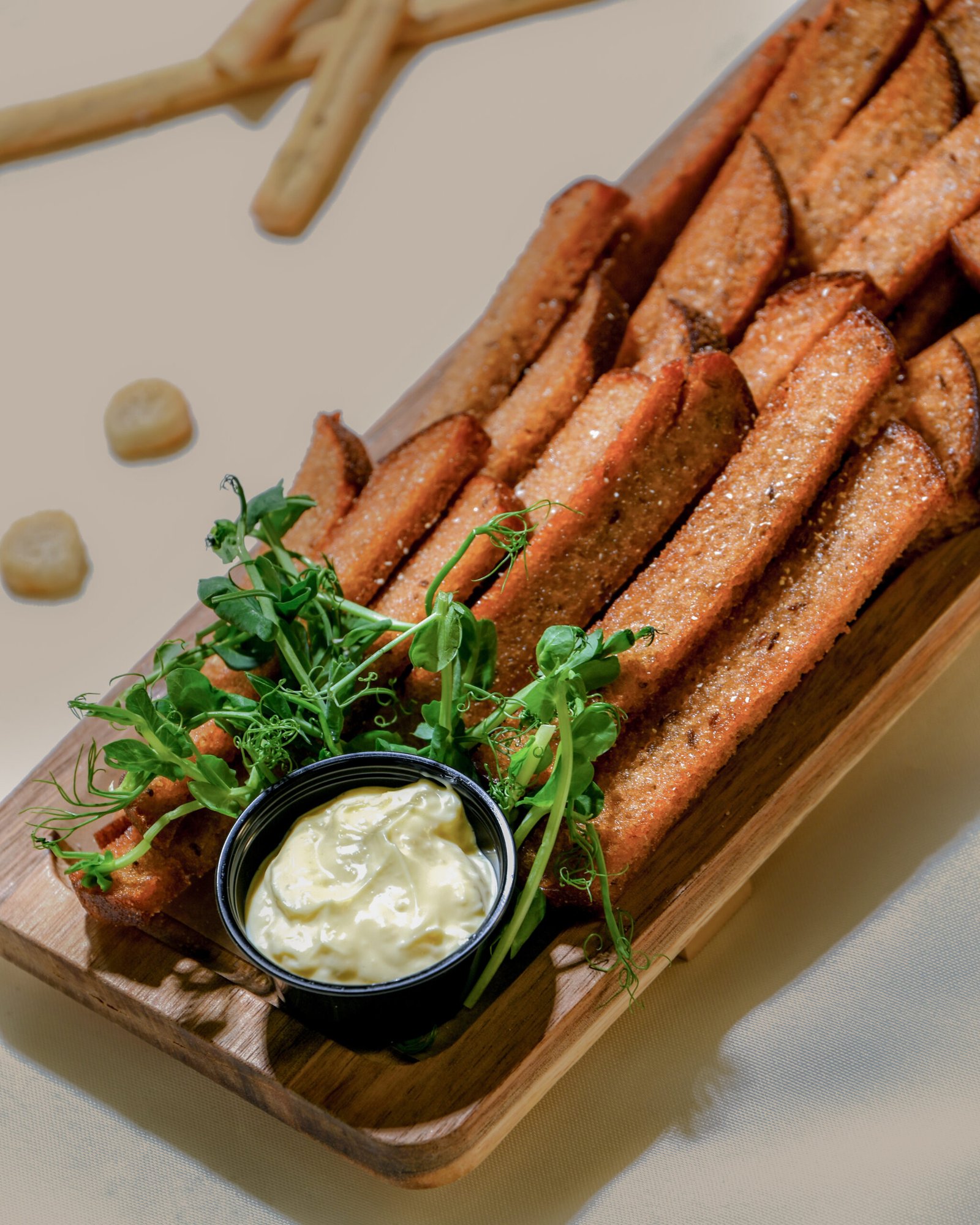 Švežiai kepta duona su druska, česnakais ir majonezo-kietojo sūrio padažu.