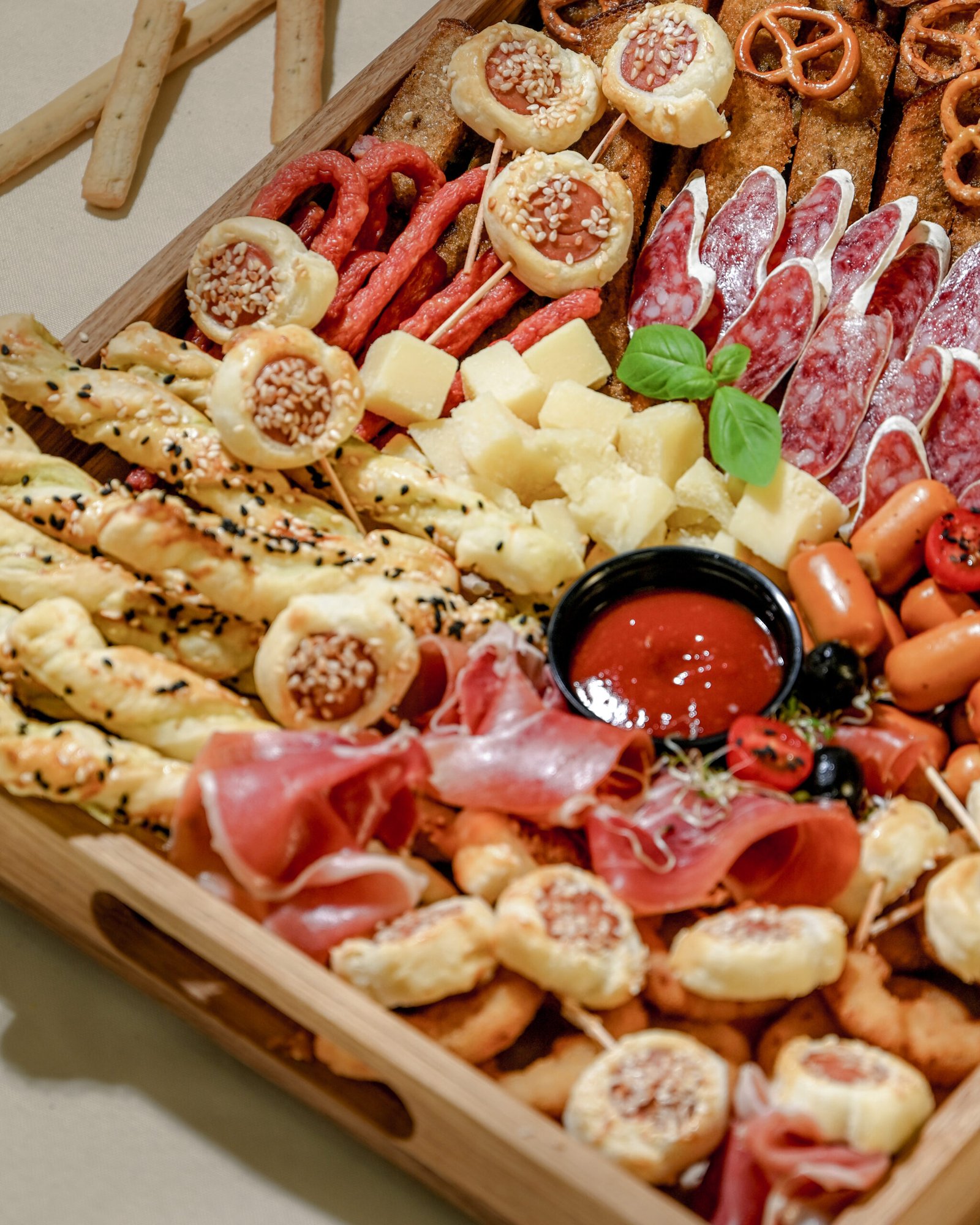 – rankų darbo kąsneliai su dešrele ir padažu;